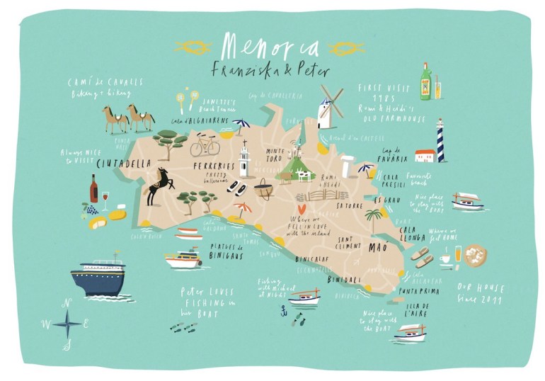 Private commission of a custom illustrated map of the island of Menorca (hidden gem of the Balearic Islands, Spain).