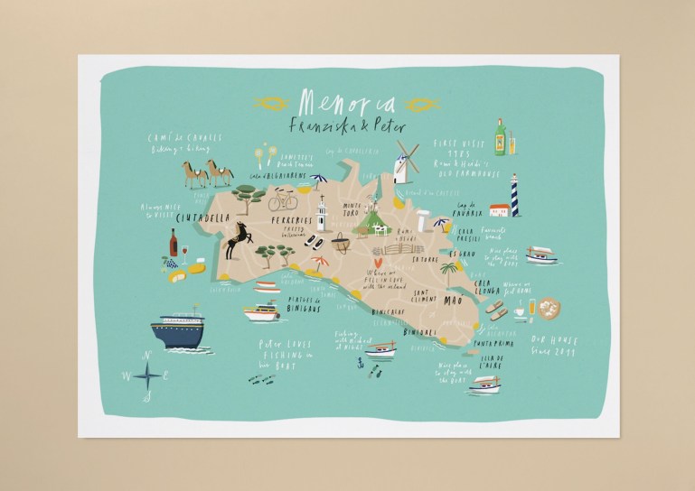 The map depicts main places and icons that are representative of the island’s identity, with handwritten annotations to mark some special memories of the relationship of this lovely couple.