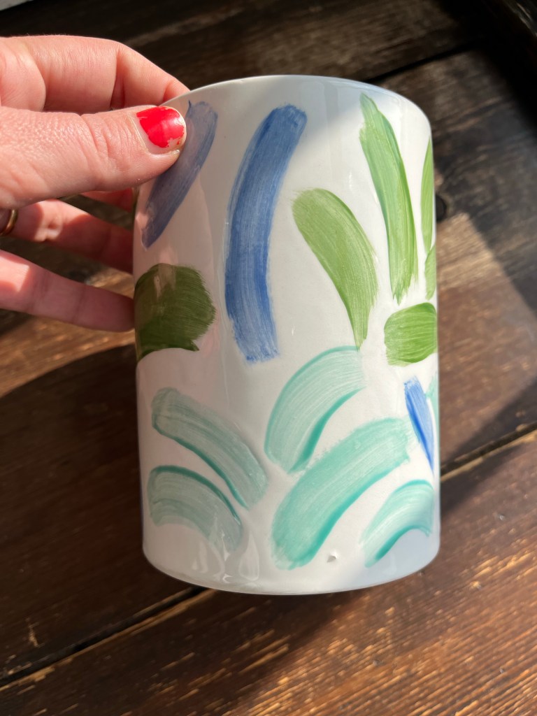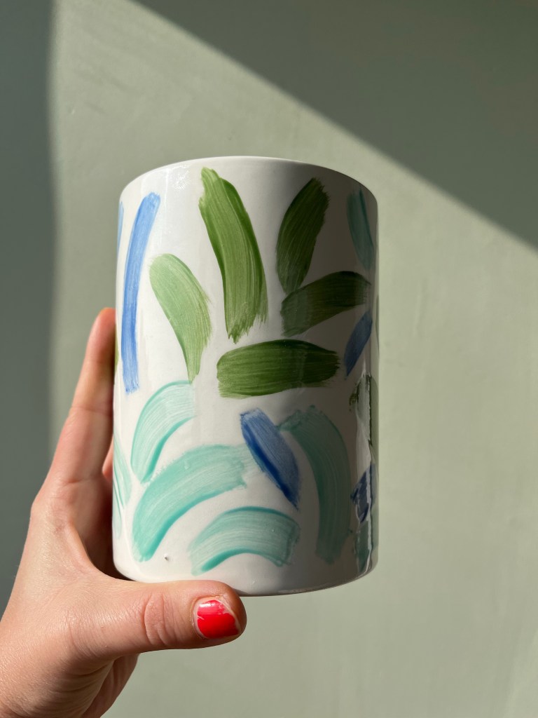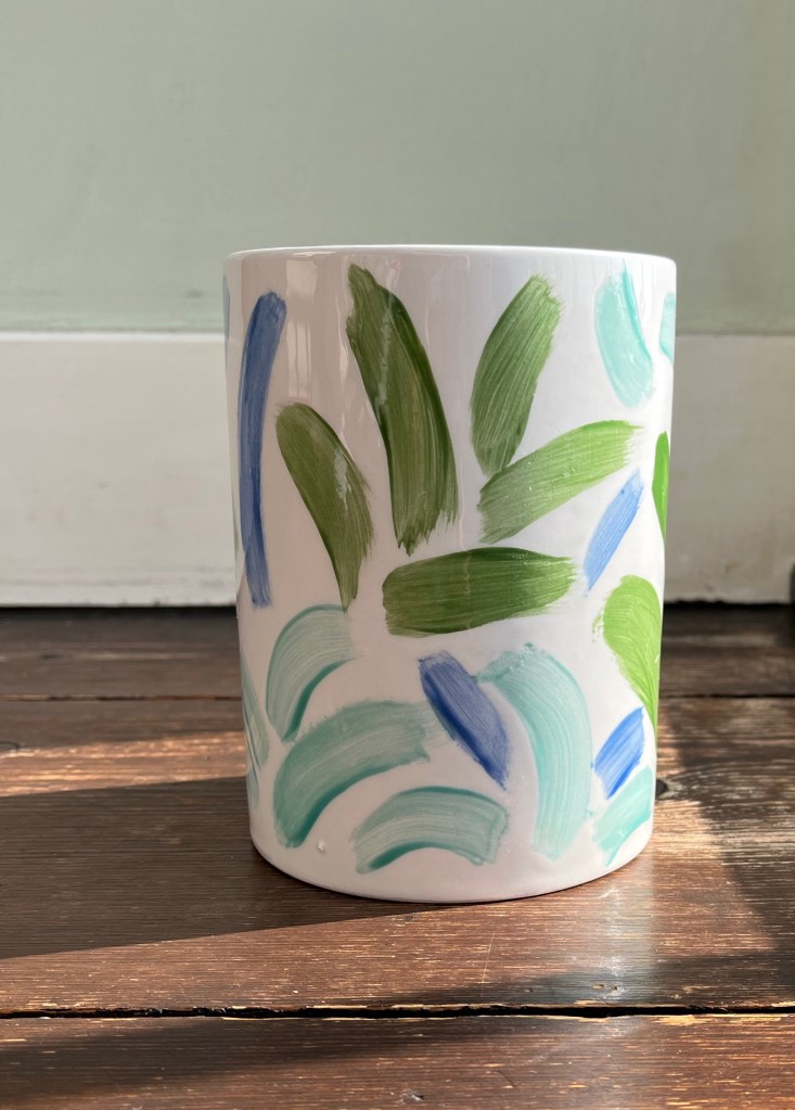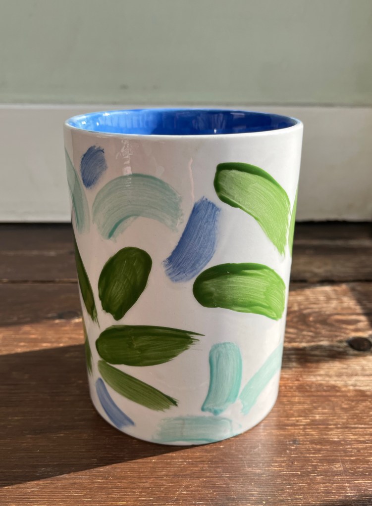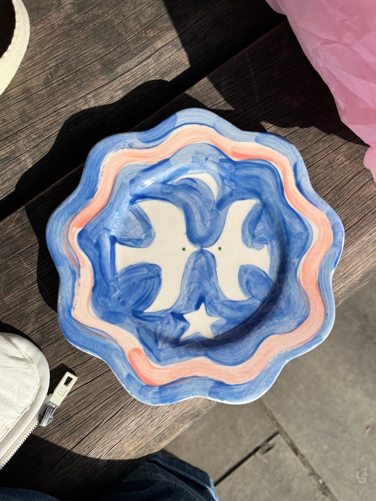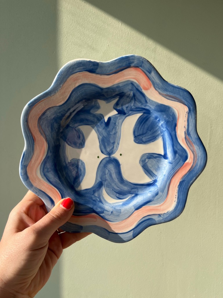 I had a great time painting these two pieces at Salts Pots in Saltaire – one is a large cylinder, kind of straight vase or brush pot I’ve painted in cobalt blue on the inside, and the outside has green and turquoise palm leaves and aloes, and some blue strokes representing the wind or sea waves. The other one is a small round plate with a wavy border where I painted two white love doves, a half moon and a star – leaving them white out of a blue background. The rim has a pink wave running along the border replicating the piece shape.